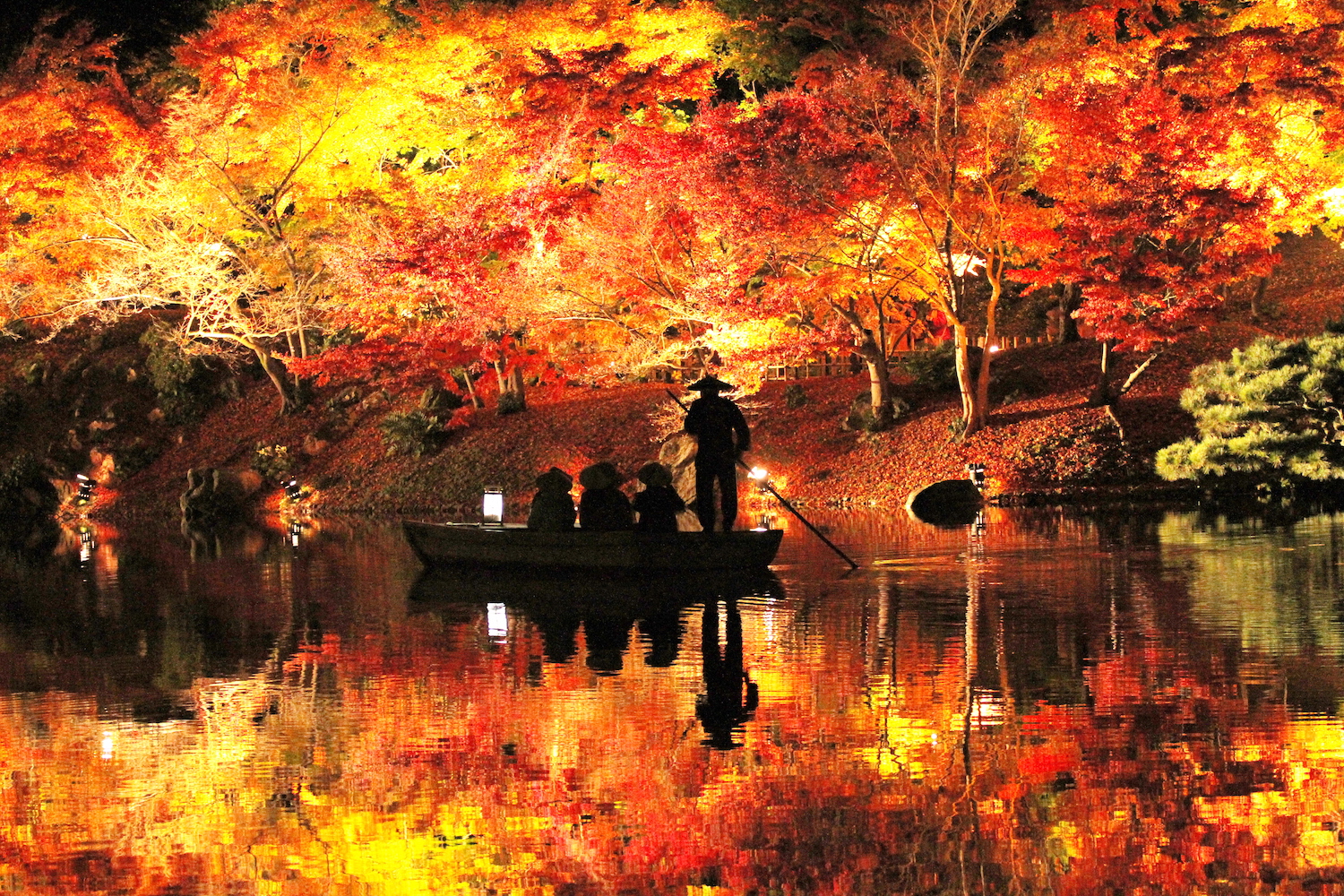 - 内容:紅葉に染まる園内がライトアップされ、モミジやイチョウが池に映る幻想的な風景を演出。 夜間の和船遊覧や茶屋の特別営業も実施し、日中とは異なる静寂と光の庭園美を堪能できます。