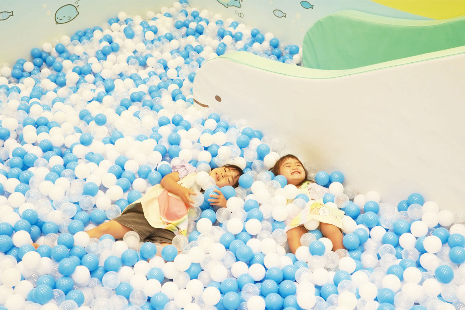 「すみっコぐらし」の世界観で遊べる屋内施設。すべり台やボールプール、ごっこ遊び、ぬい撮りコーナーなど、親子で楽しめるコンテンツが盛りだくさんです。