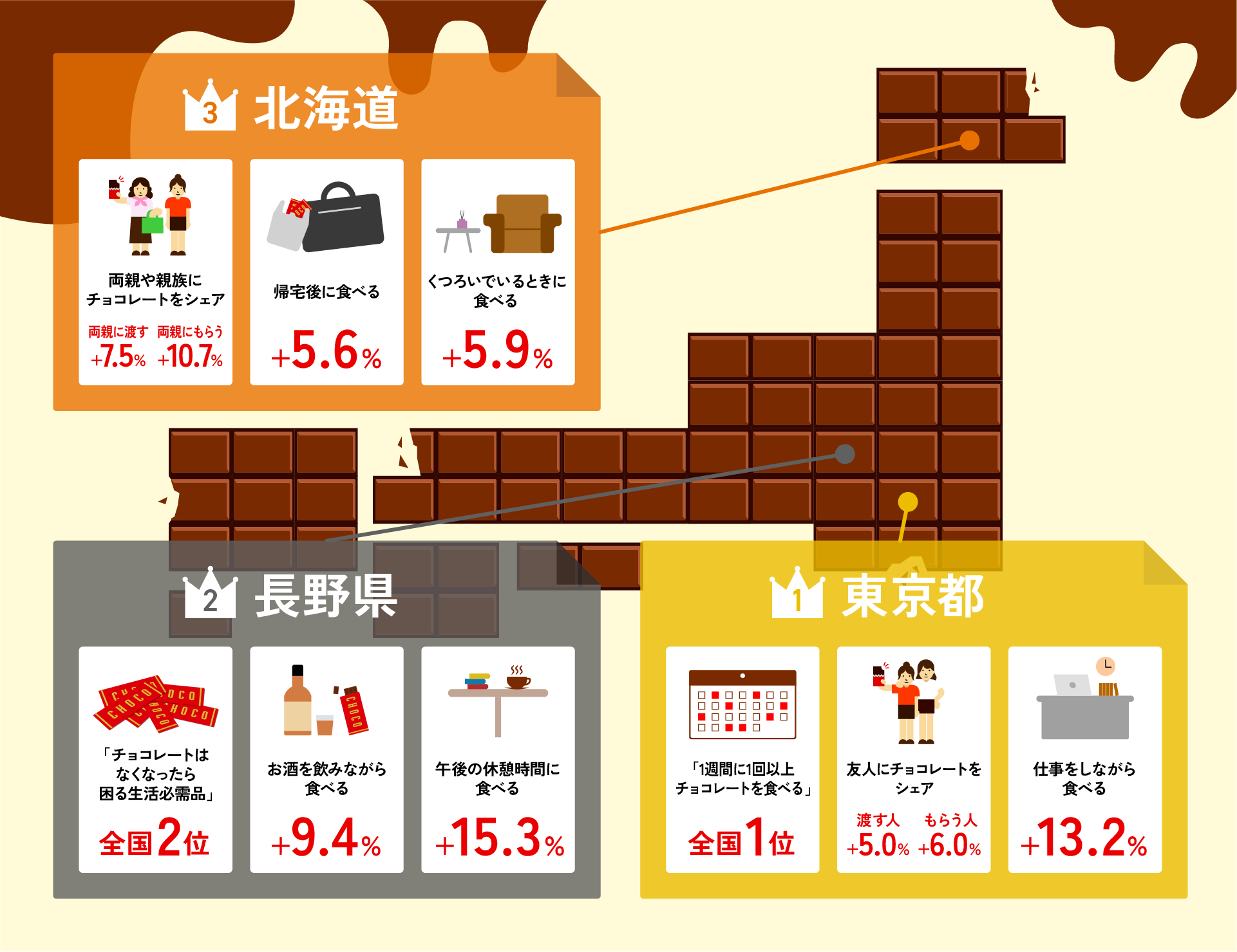 調査の結果、チョコレート愛好度トップは東京都、続いて長野県、北海道という結果になりました。各地域にはチョコレートの楽しみ方に特徴があり、日常生活での関わり方にも違いが見られます。
