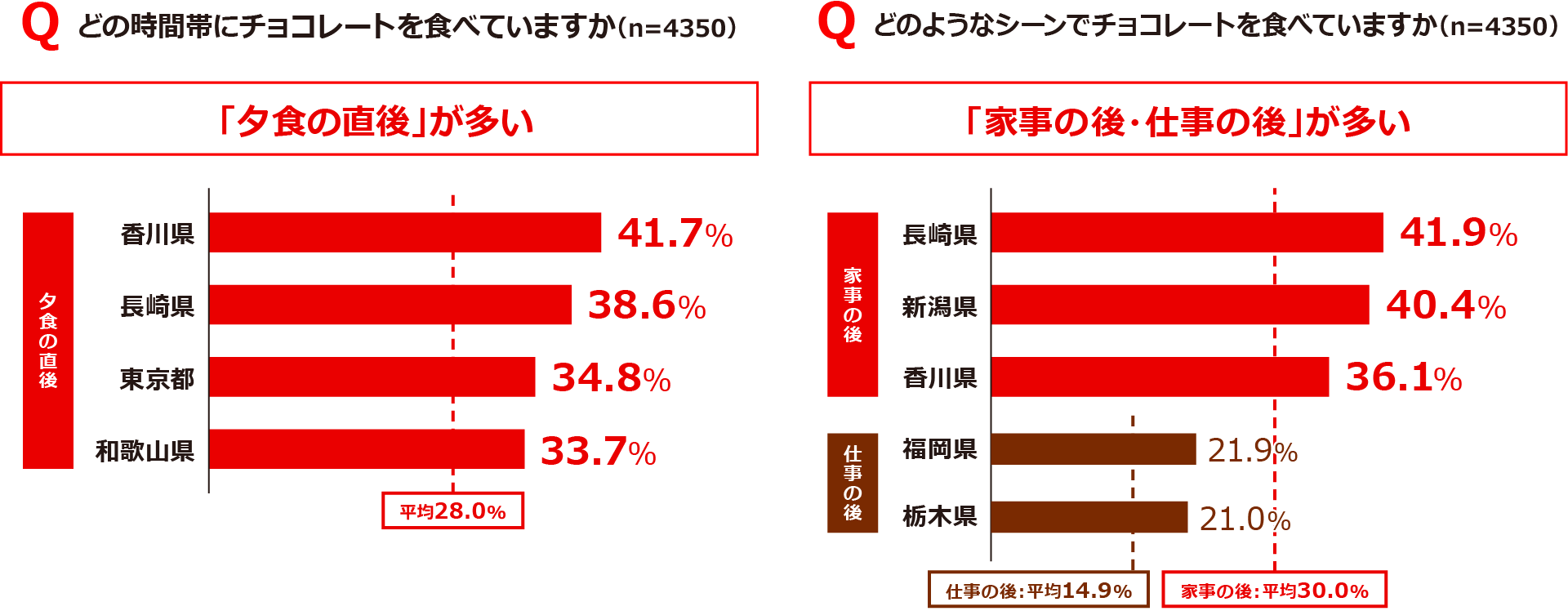 • 長野県:両親・親族とのチョコのシェアが多く、「帰宅後」「くつろぎ時間」に食べる人が全国平均を上回る。