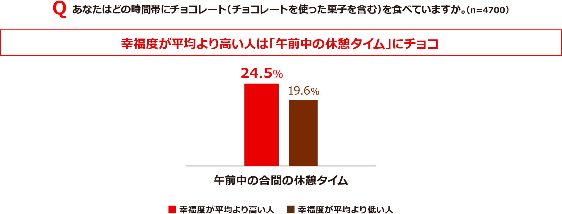 時間帯別の分析では、幸福度の高い人は低い人に比べて午前中の休憩時間にチョコを食べる割合が4.9%高いことが判明。短いリフレッシュタイムでのチョコが、気持ちの切り替えや前向きな思考に寄与している可能性が考えられます。