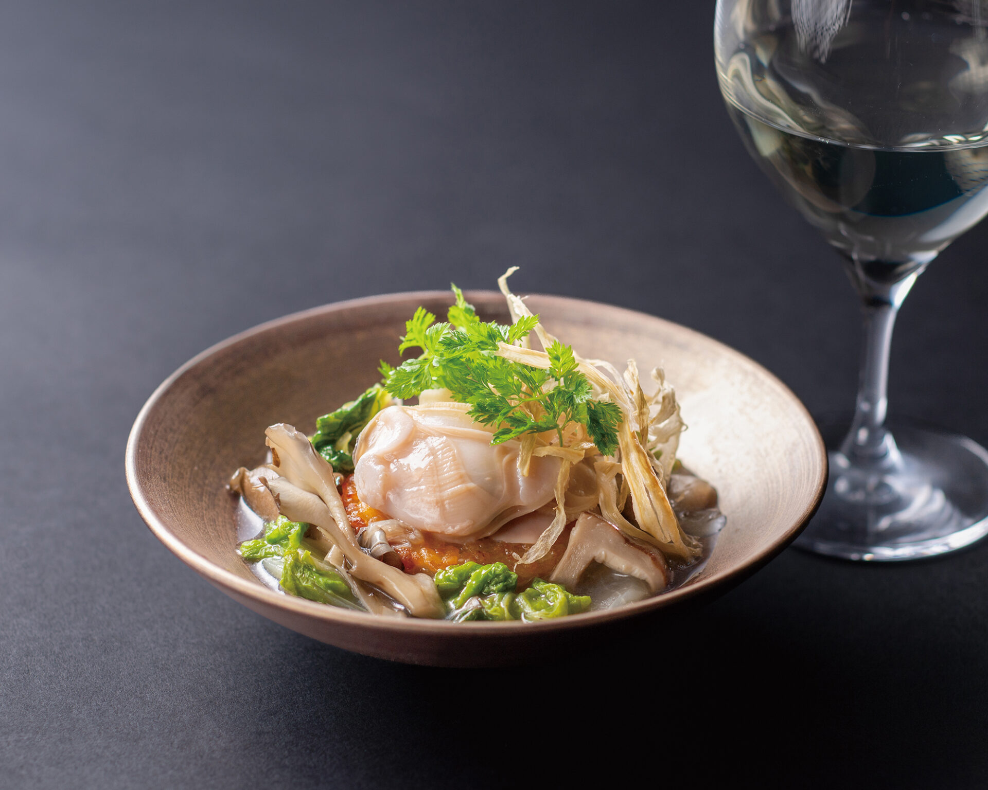 優しい野菜の出汁に蛤の旨味が溶け込むスープが「志摩」のふくよかさと調和し、常温に近い温度で味わうことで香りと旨味が一層引き立ちます。