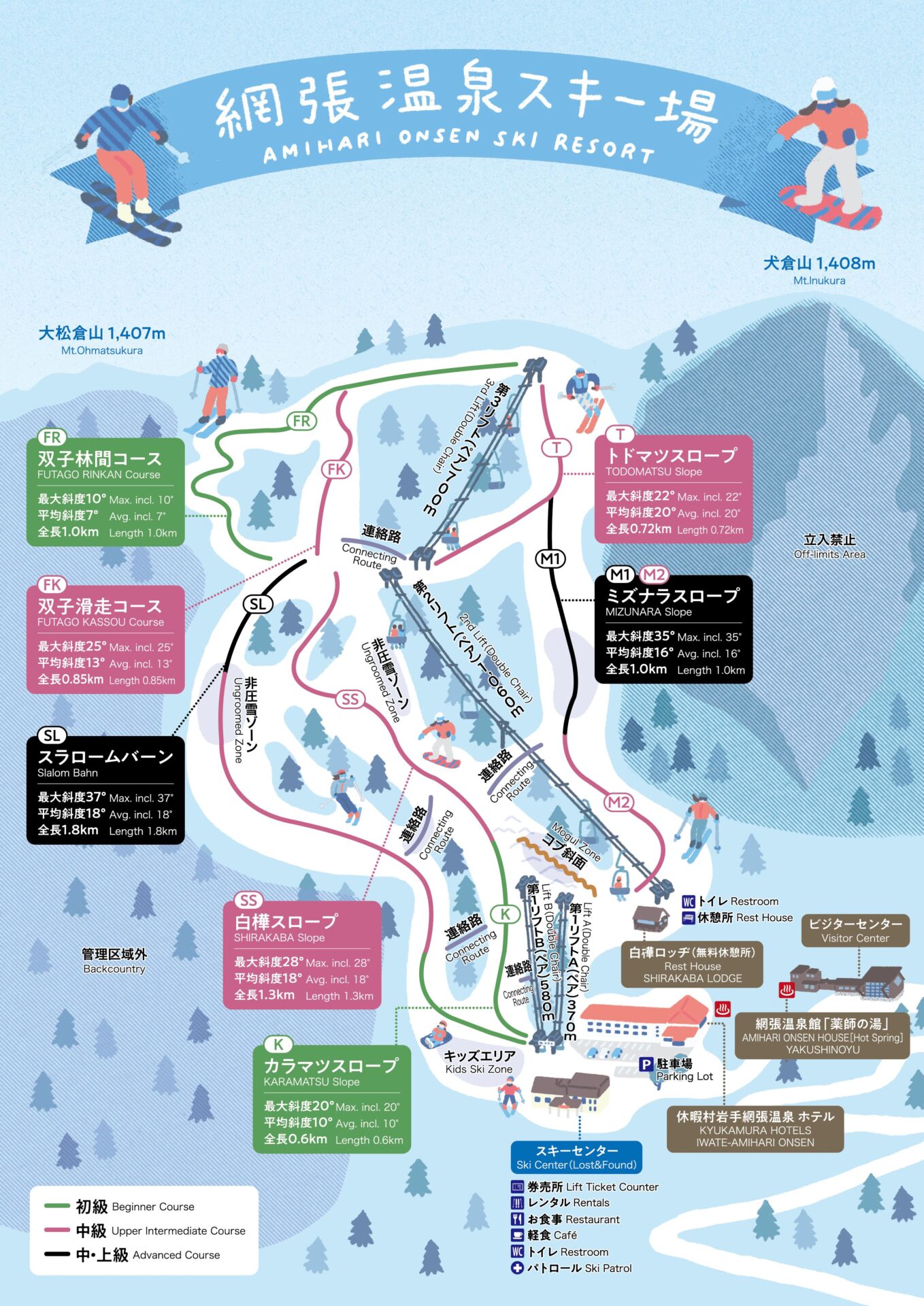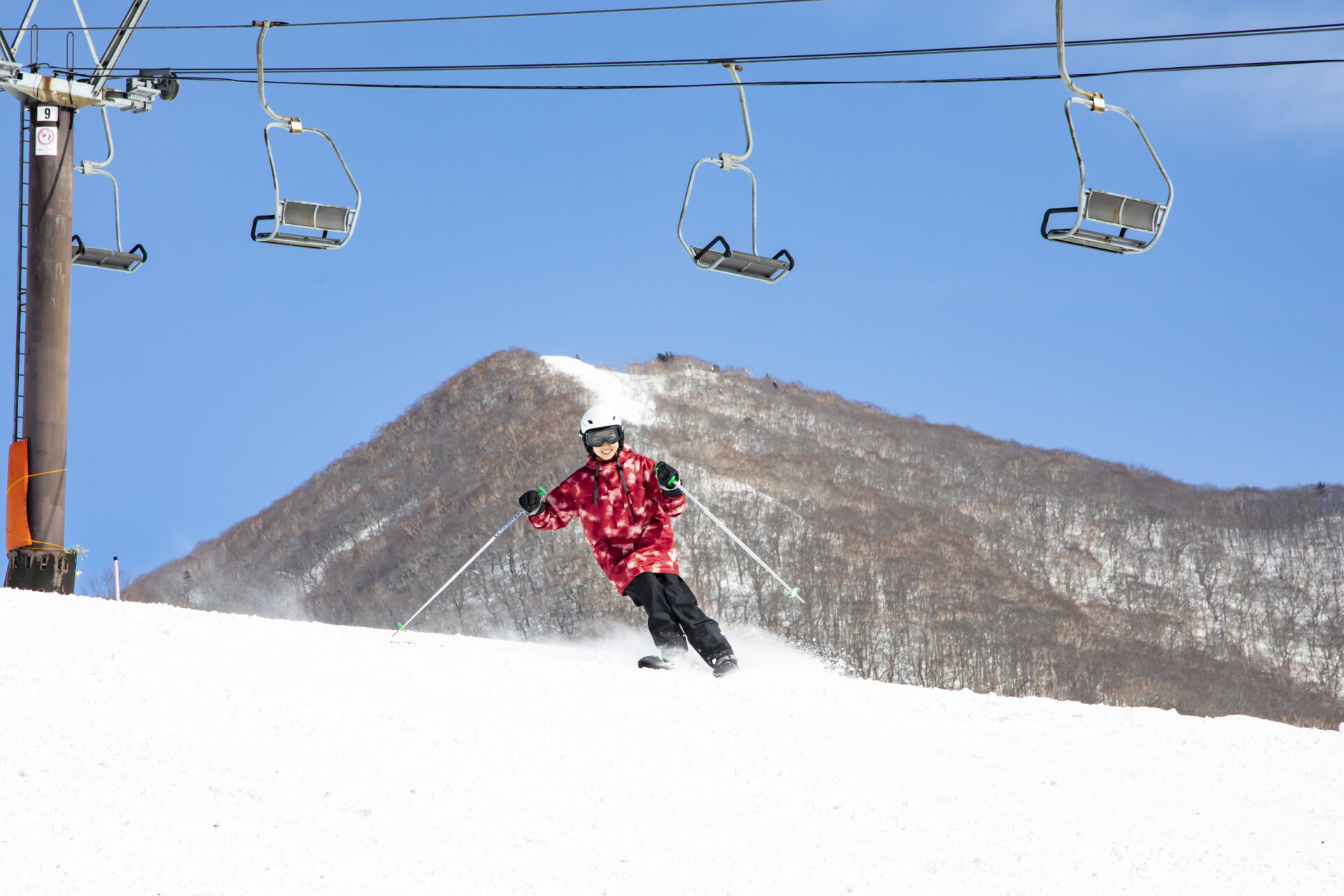 最大斜度35度、最長1kmのダウンヒルから、ネットで仕切られたキッズパークまで、初心者から上級者まで幅広いレベルに対応。岩手県内最高所に位置するゲレンデで、上質なパウダースノーを存分に楽しめます。