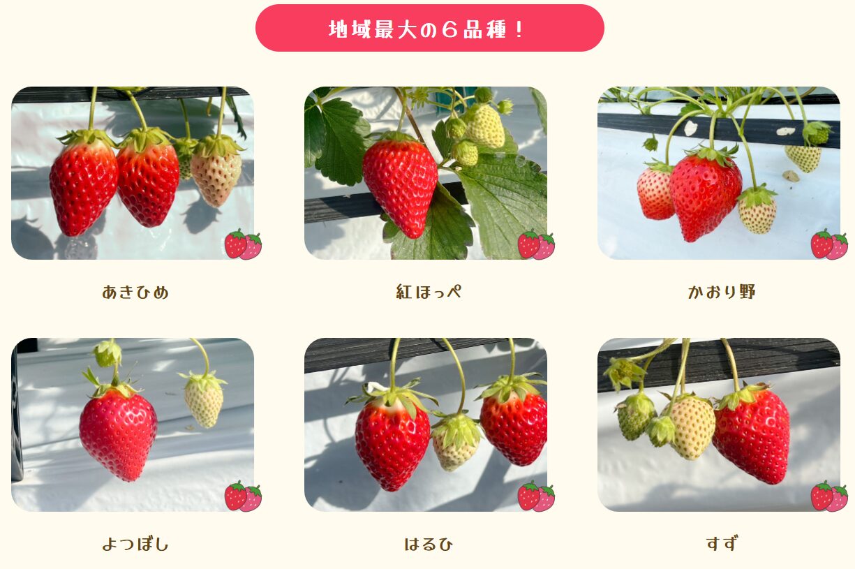 福助ファームでは、甘みや酸味、食感、大きさが異なる6種類のいちごを同時に楽しむことができます。品種ごとの個性がはっきりしており、食べ比べを通してその違いを実感できます。