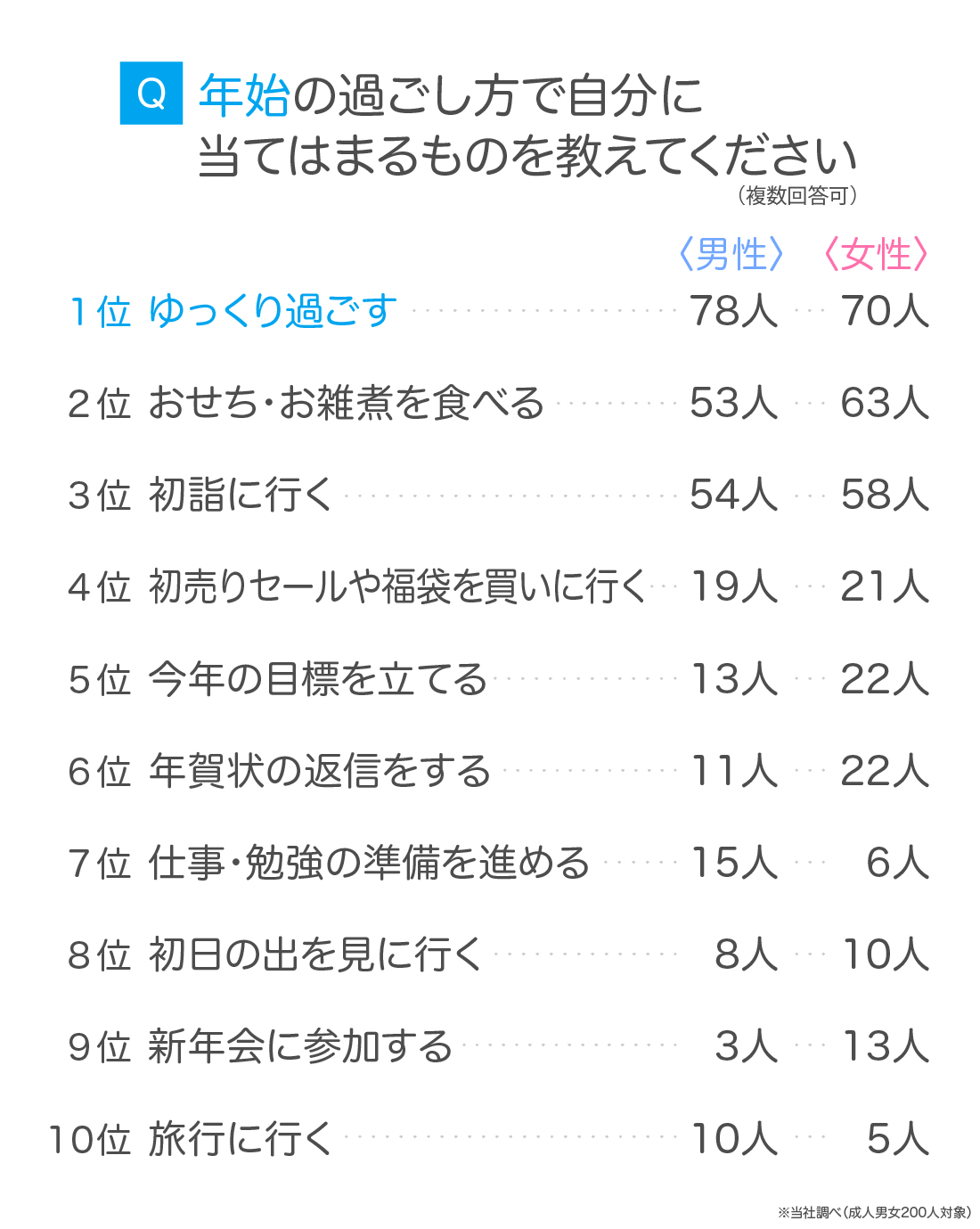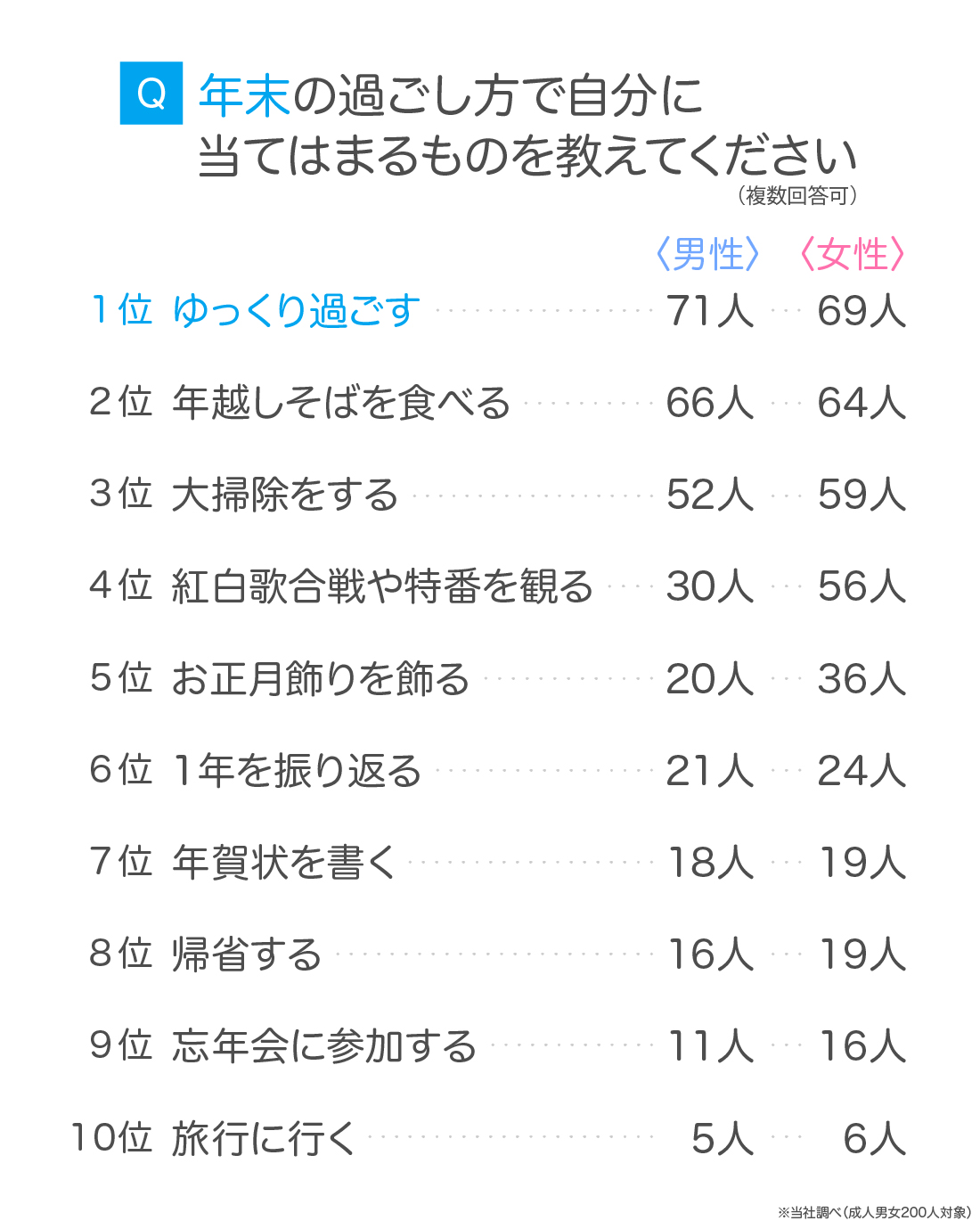 6位以下には「1年を振り返る」「年賀状を書く」「帰省する」「忘年会に参加する」「旅行に行く」などが続き、外出を伴う行動は比較的少数派となりました。