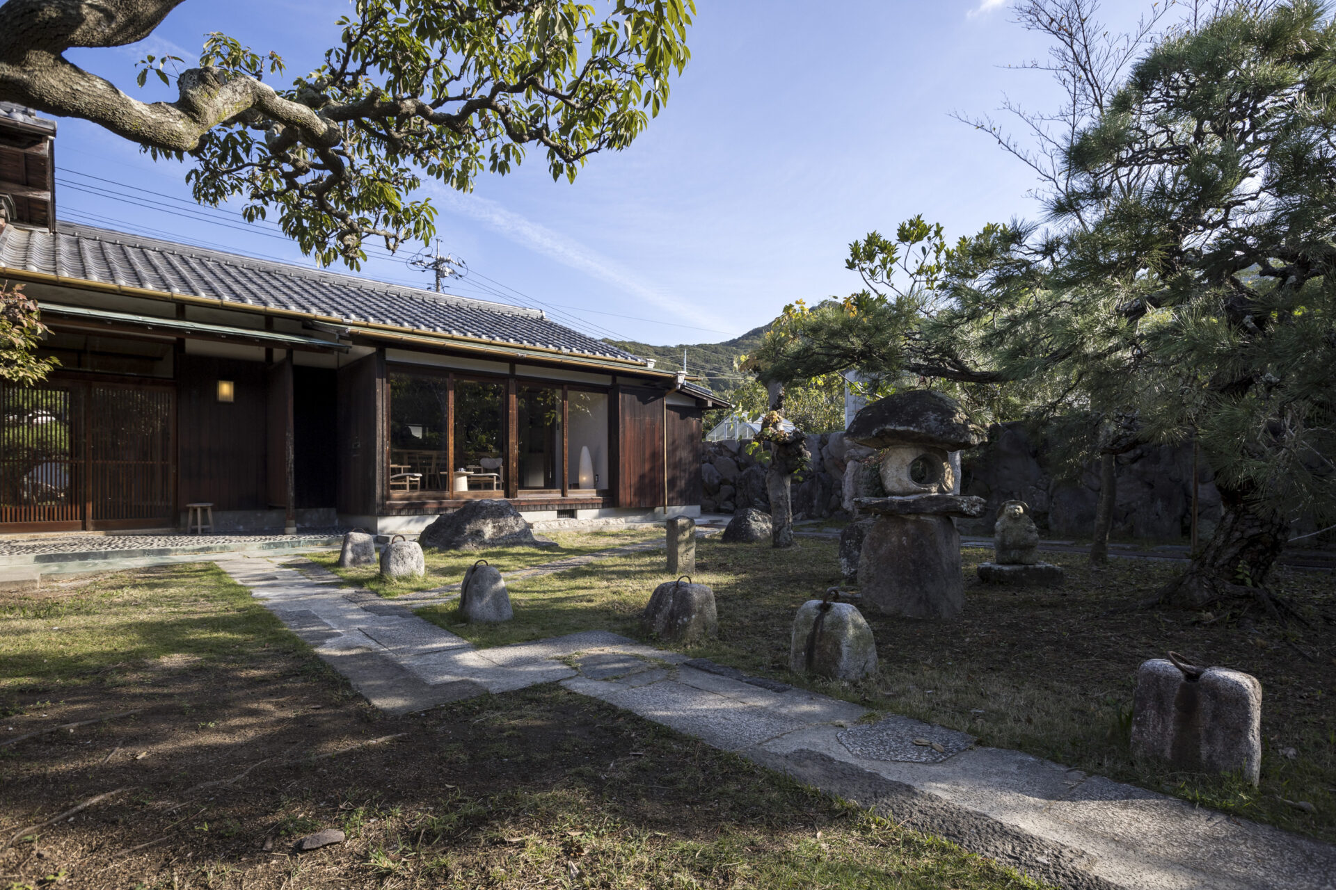 小豆島リトリーツ株式会社(香川県小豆郡小豆島町、代表取締役:加藤直樹)が運営する一棟貸し宿「お屋敷ステイ 幸(こう)」では、玄関へと続く石畳のアプローチに、かつて醤油づくりで使われていた重石が静かに並んでいます。