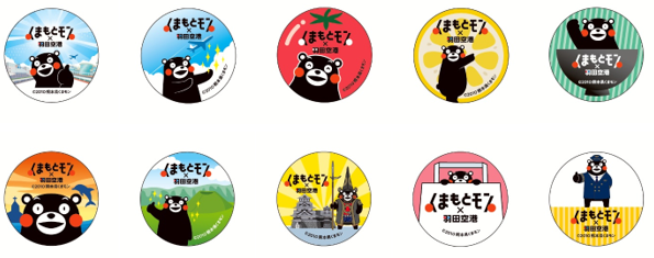 イベント各所で、対象商品購入やメニュー注文により、羽田空港限定デザインのくまモン缶バッジをプレゼント。全10種類で、どのデザインが当たるかはお楽しみです。