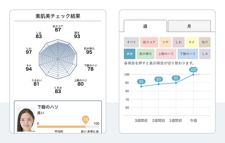 スマートフォンやタブレットを使ったAI肌分析「素肌美チェック」を体験。撮影画像から現在の肌状態を数値化し、花実茶の結果と照らし合わせながら、今の自分を客観的に知ることができます。