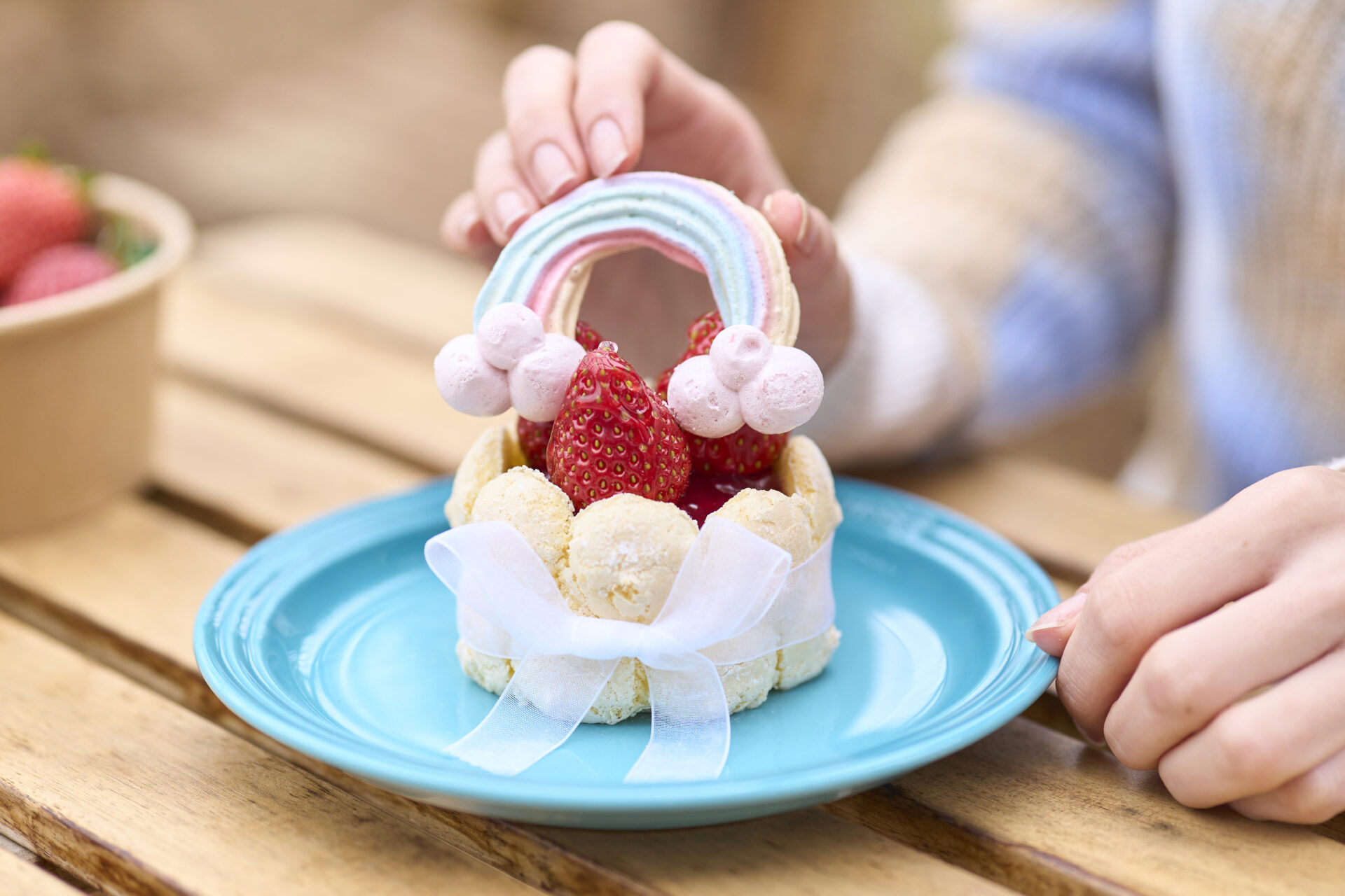 収穫したいちごをふんだんに使用し、甘酸っぱいいちごのジャムとジュレを閉じ込めた濃厚なバニラ風味のババロアを、「雲」をイメージしたスポンジで包んだケーキに、トッピング用の「虹のメレンゲ」を用意。ゲストは「オズのストロベリー」と「虹のメレンゲ」を自由にデコレーションし、自分だけのスイーツを完成させる体験ができます。