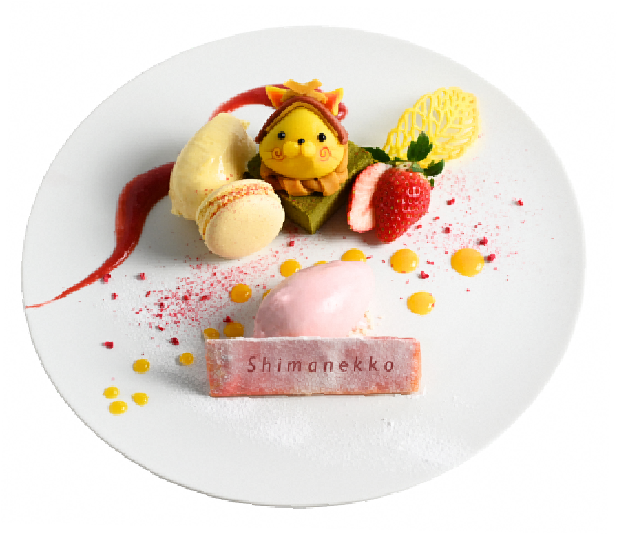 しまねっこモチーフの生菓子を主役に、出雲抹茶の台湾カステラ、ホワイトチョコムース、いちごミルクジェラートを盛り合わせた、見た目も華やかなデザートプレートです。