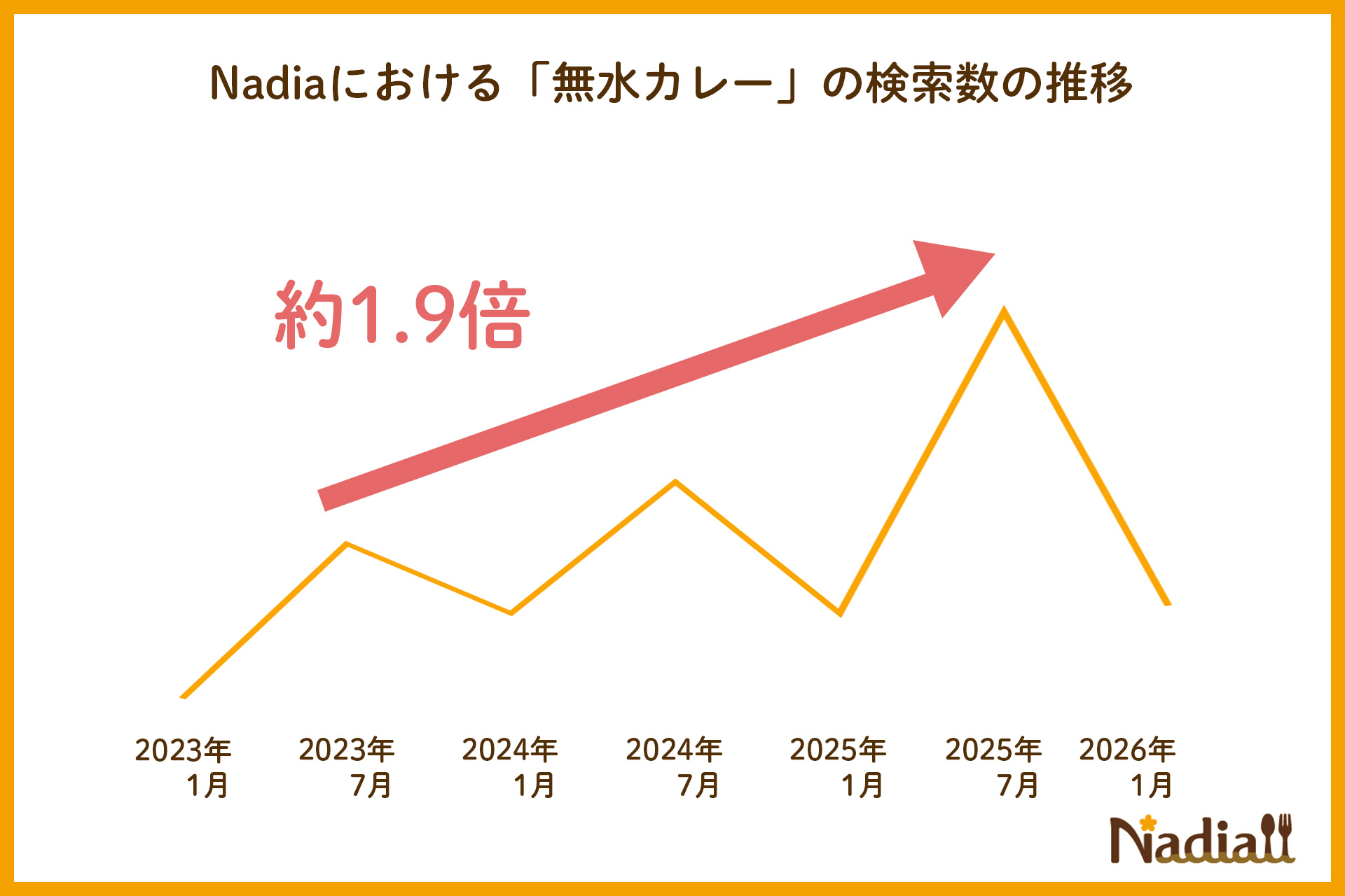 さらに注目を集めているのが「無水カレー」です。水を使わず、野菜や食材の水分だけで仕上げる調理法は、2023年と2025年の検索数を比較すると約1.9倍に増加しました。素材の栄養とうま味を凝縮できる点が評価され、特に夏場を中心に関心が高まっています。