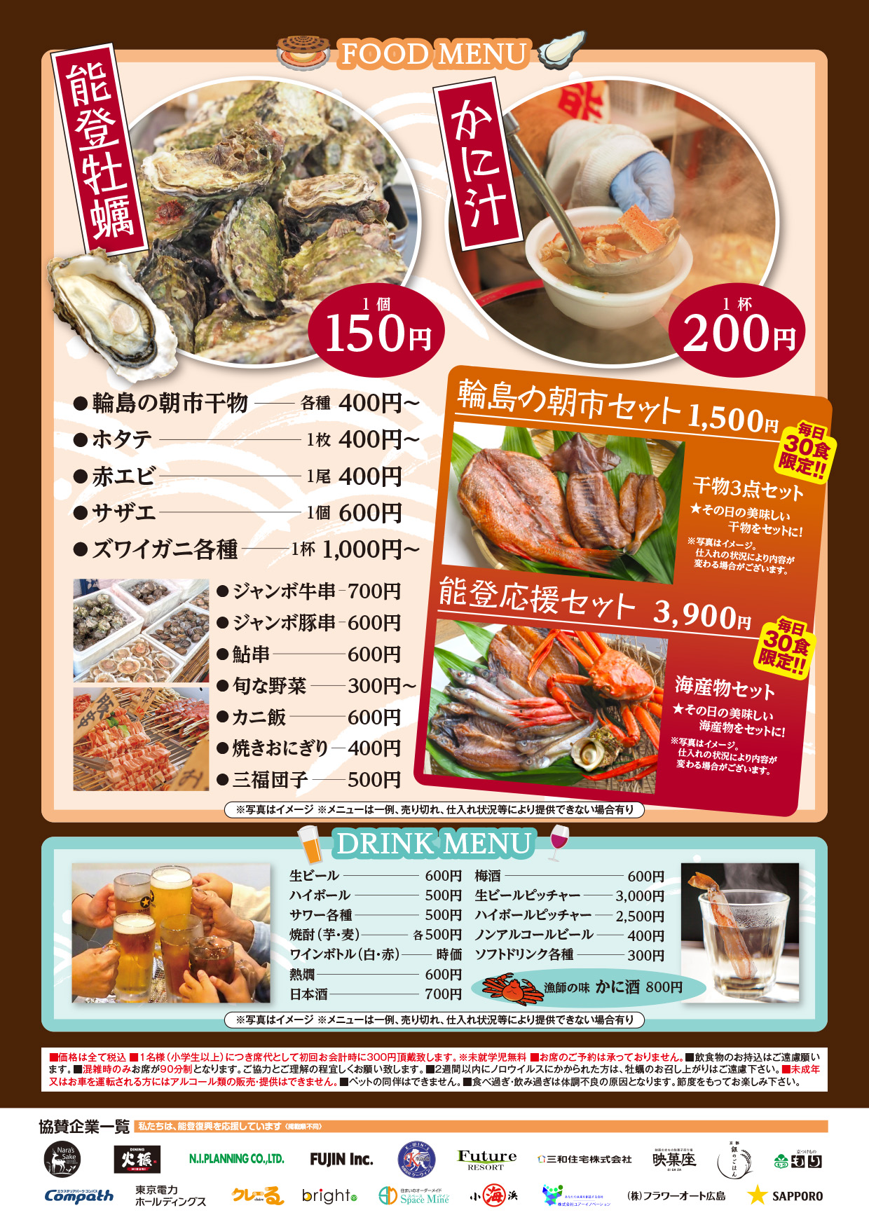 能登の現地の雰囲気を感じながら食事を楽しめるよう、一部メニューは協賛価格で提供され、より多くの方が気軽に参加できる内容となっています。