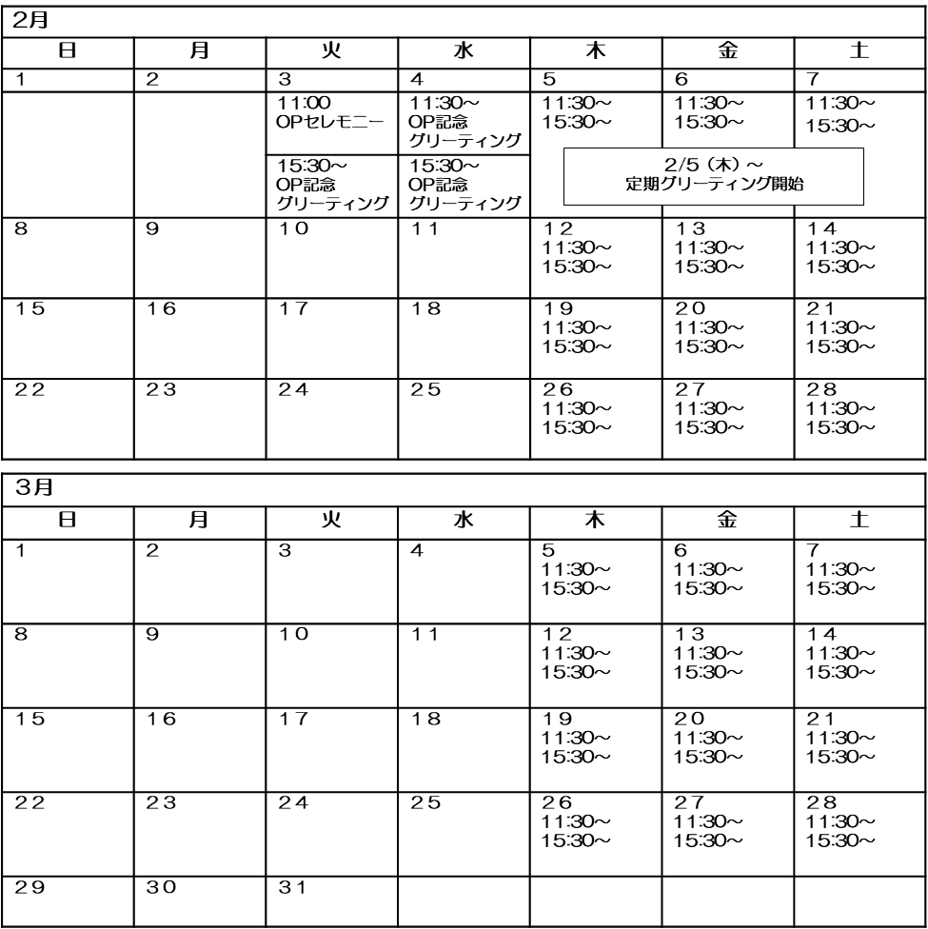 ※グリーティング開催日の12:00~15:00は、事前予約不要で自由見学が可能です。