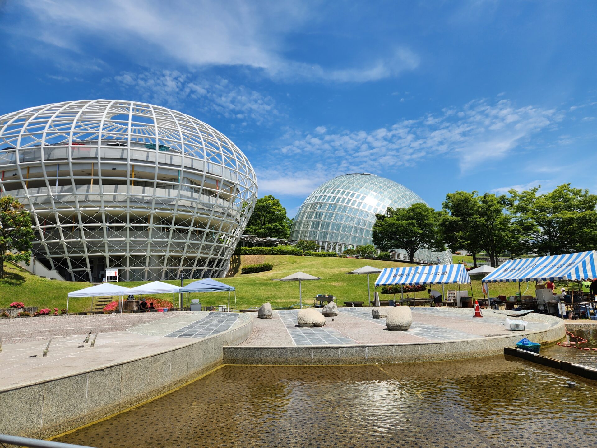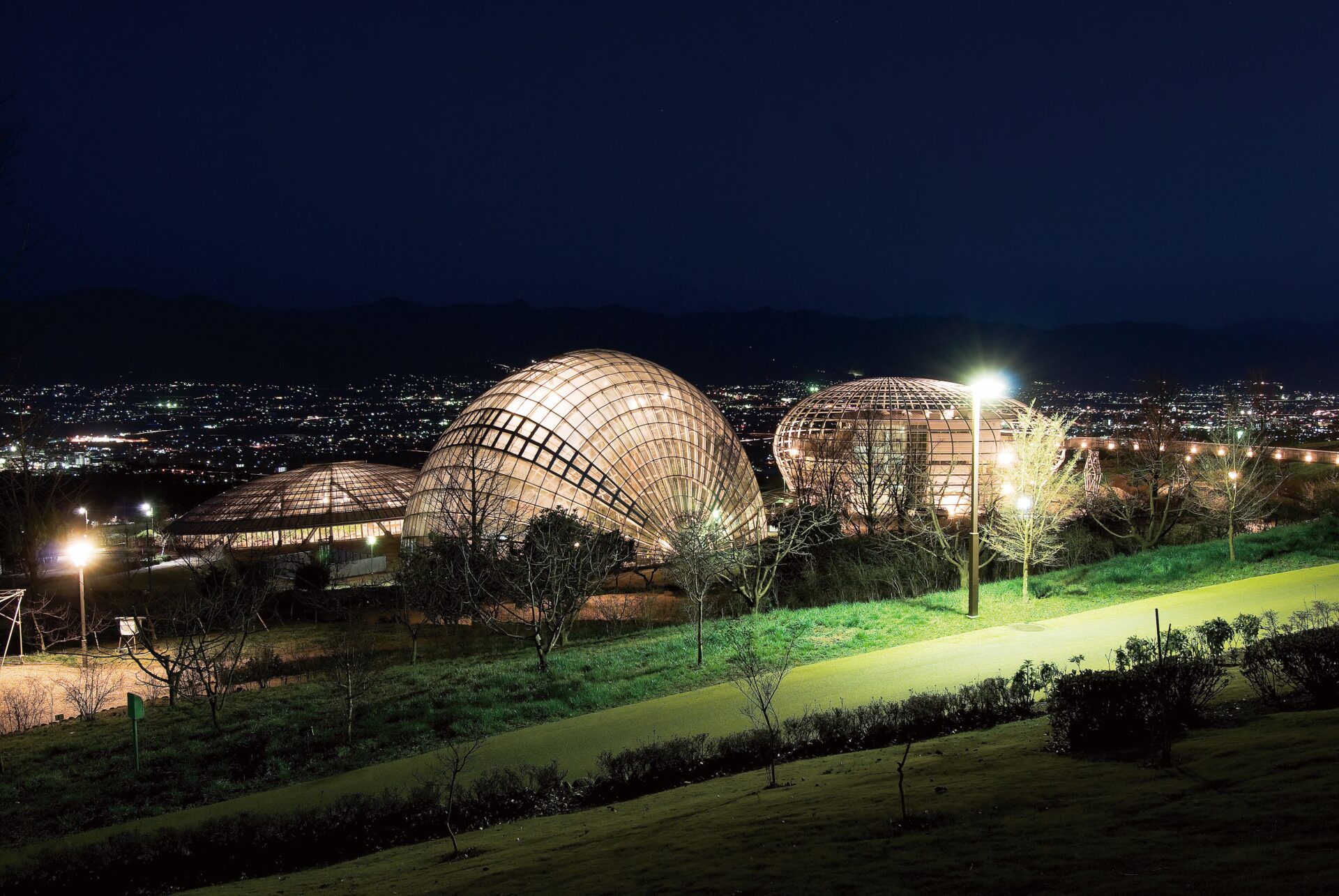 富士山や八ヶ岳、南アルプスに囲まれた高台に位置し、約32haの広大な敷地には、くだものの種子をイメージしたドームが点在。峡東地域ならではの自然と調和した景観が広がります。