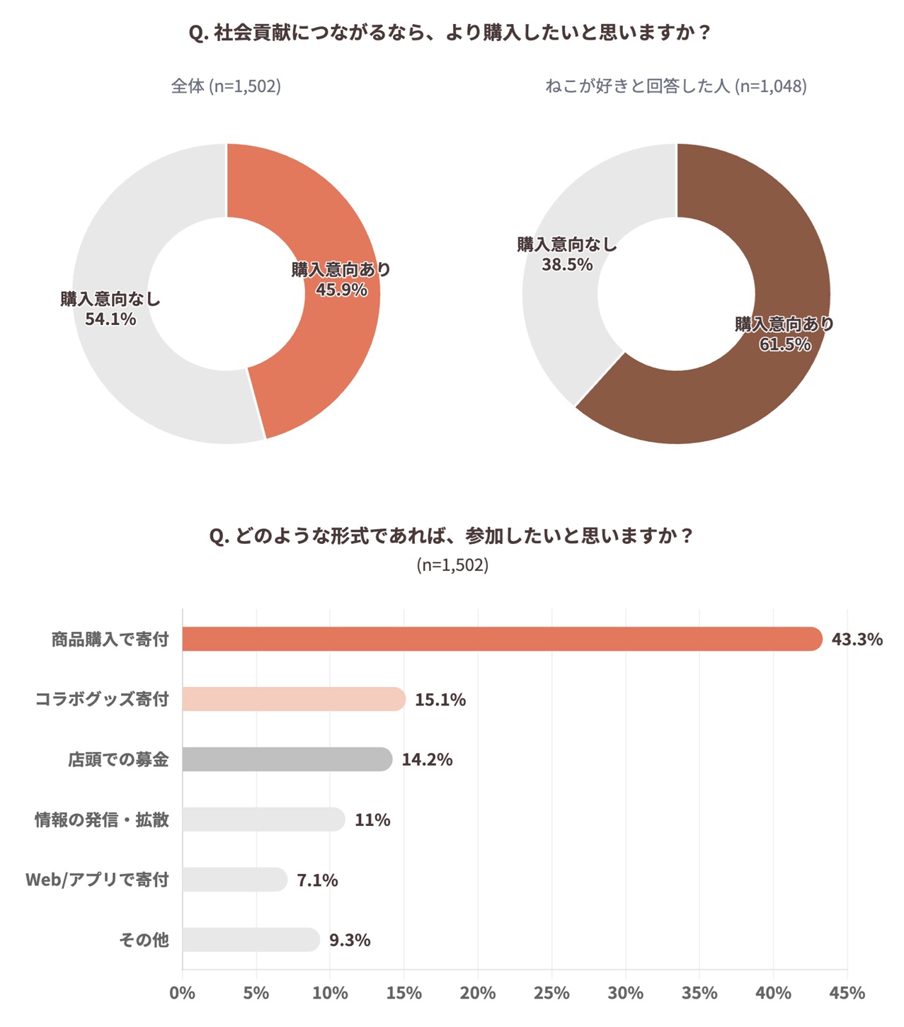 「商品購入が保護猫支援につながるなら、より購入したい」と答えた人は45.9%(ねこ好き層では61.5%)。「商品購入で寄付につながる仕組み」が最も参加しやすい支援形式として支持されました。