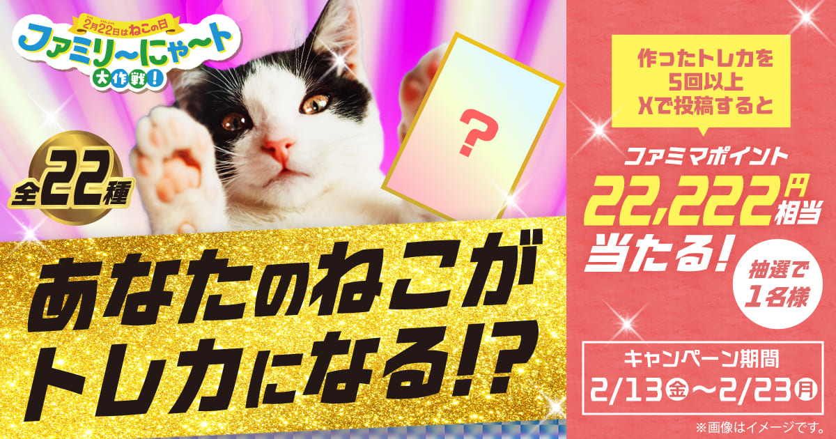 特設サイトで作成した愛猫トレカ画像を、公式X(@famima_now)をフォローし指定ハッシュタグ付きで投稿すると、抽選でファミマポイント22,222円相当が当たるキャンペーンも実施中です。