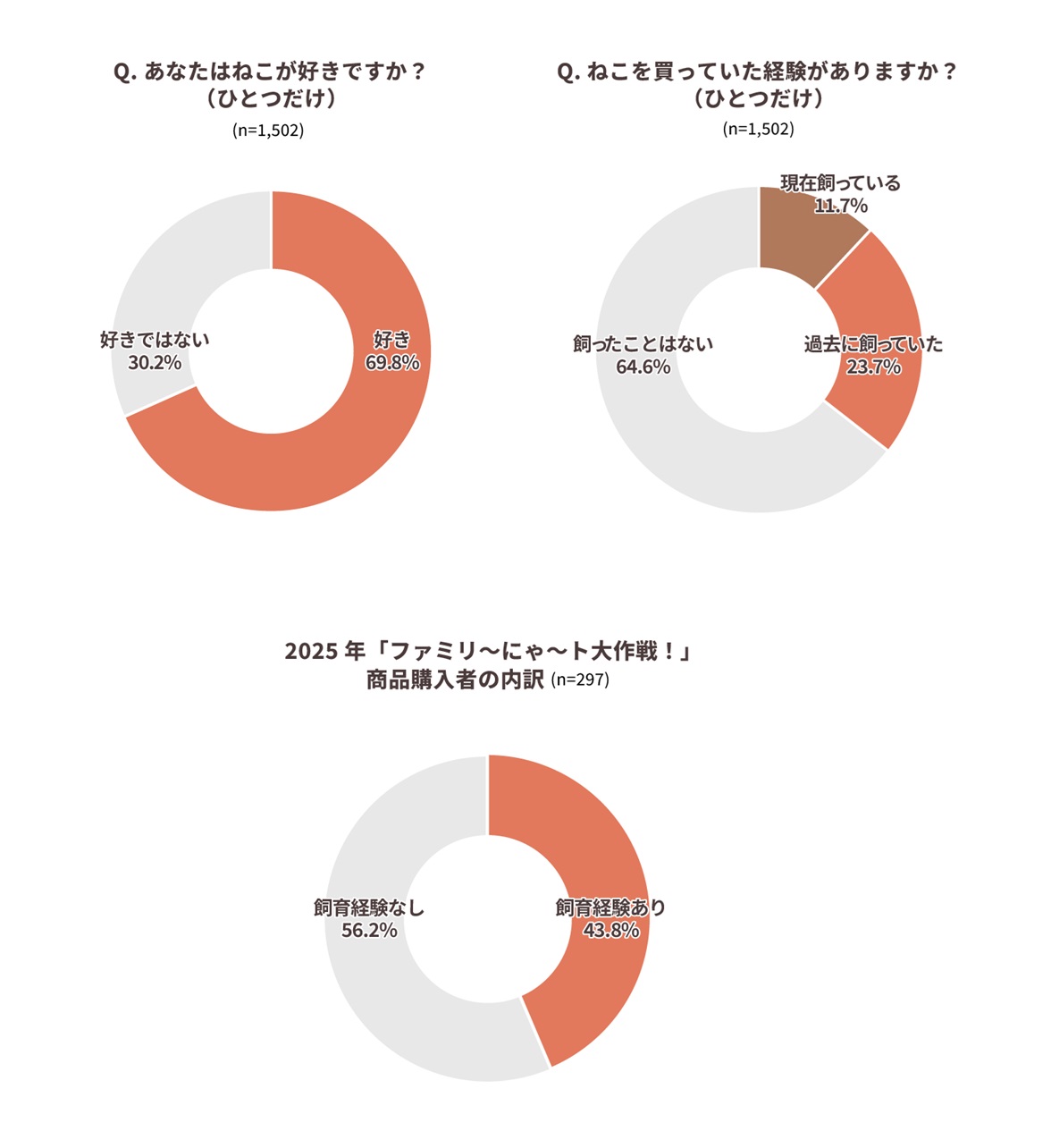 ファミペイ会員1,502人を対象にした調査では、「ねこが好き」と回答した人は69.8%。一方、現在ねこを飼っている人は11.7%にとどまりました。