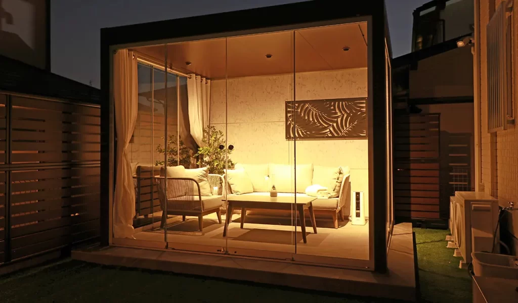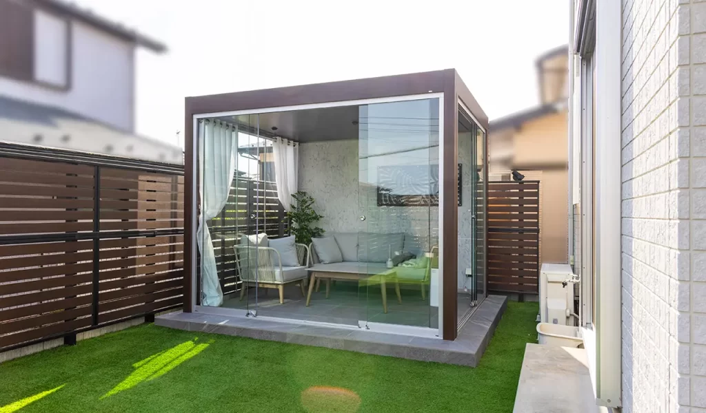 今回公開した事例は、母屋と繋がったサンルームタイプではなく、庭の中に独立して存在する「離れ」としてのガーデンルームです。ガラス張りの開放感あふれるデザインを採用し、周囲の視線を適度に遮りながらも、光と風を感じられるラグジュアリーな空間を実現しました。