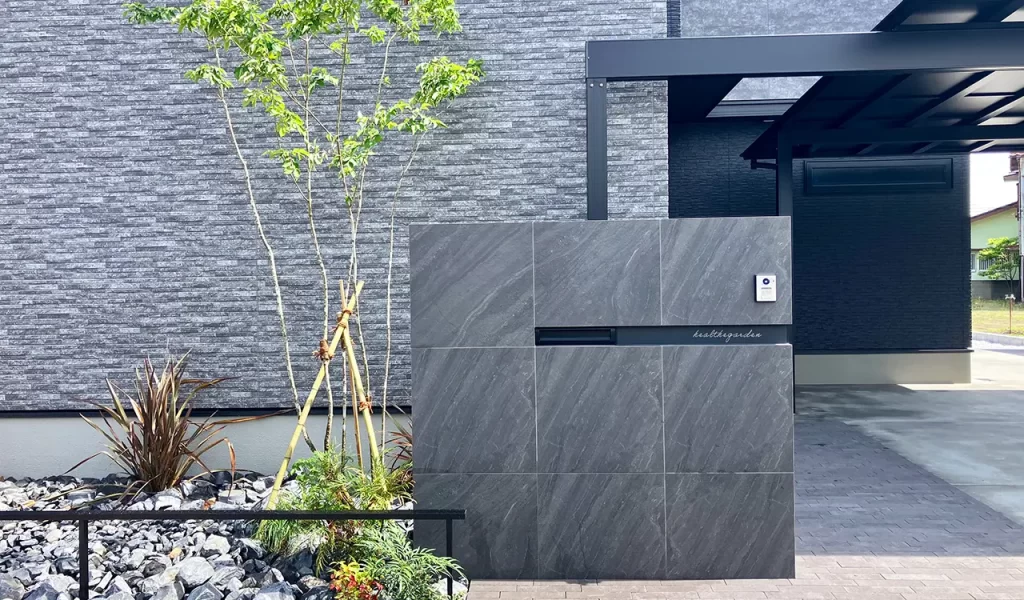 建物がグレーとブラックを基調としたモダンデザインであることから、外構も同系色で統一。門袖にはダークグレーの600角タイルを採用し、無駄を削ぎ落としたミニマルな印象の中に、重厚感と高級感を演出しました。直線的なフォルムと質感のある素材選びにより、建物との一体感を高めています。