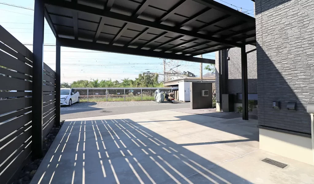 カーポートにはブラック仕様を採用し、住宅全体のトーンと統一。梁延長タイプとすることでアプローチ動線を妨げず、視線の抜けを確保しました。圧迫感を抑えながら、機能性とデザイン性を両立させています。