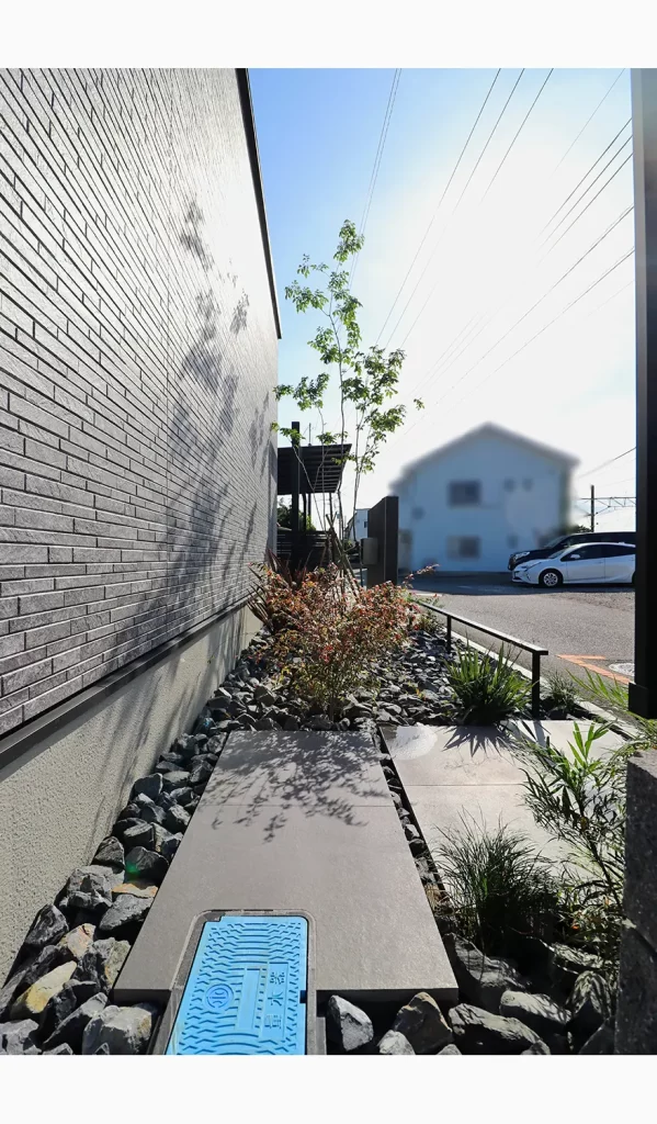 植栽スペースには割栗石を敷き込み、シンボルツリーとしてアオダモを配置。石の無機質な質感と、柔らかな緑のコントラストが外構全体に立体感を生み出します。季節ごとに変化する表情が、住まいに自然の彩りと奥行きを与えています。