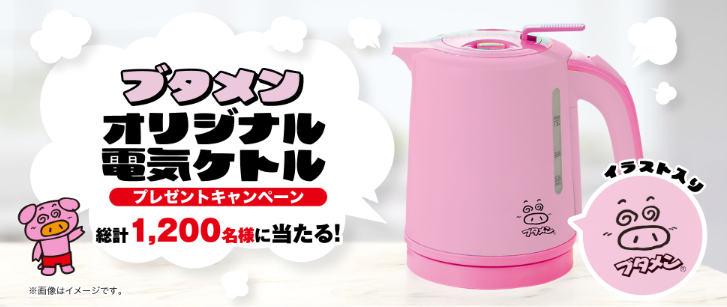 対象商品についている応募マークを集めて応募すると、ブタメンらしいピンク色のオリジナル電気ケトルが当たるキャンペーンを実施しています。