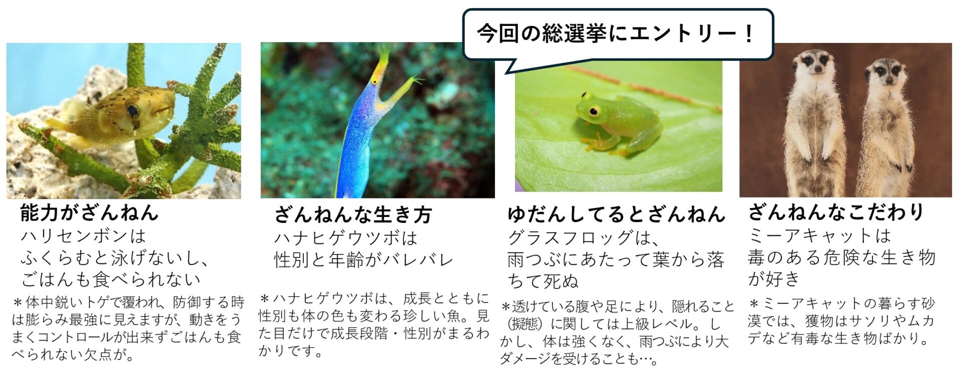 総選挙では、『ざんねんないきもの展3』会場内で紹介されている23種の生き物を対象に、来場者が“推しざんねんないきもの”へ投票できます。